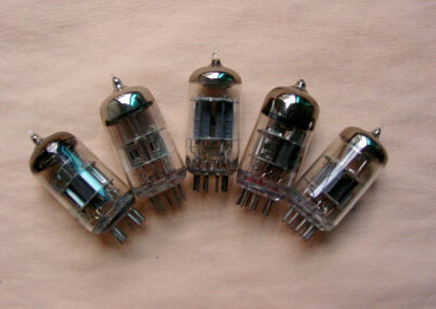 几种在音频放大器里常用的电子管图示六: 五颗前置电压放大管:6N10,12AX7,12AU7,12AX7,12AU7